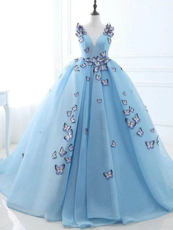 Ball Gown Long Sky Blue Butterfly V Neck Prom Dresses,Quinceanera Dresses OKE79
