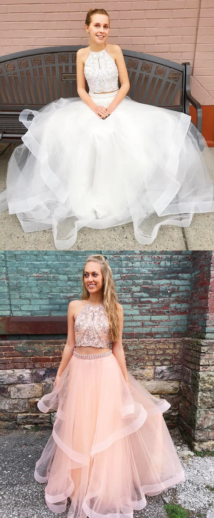 Two Piece Long Beading Long Tulle Prom Dresses,A Line Evening Dresses OKB21